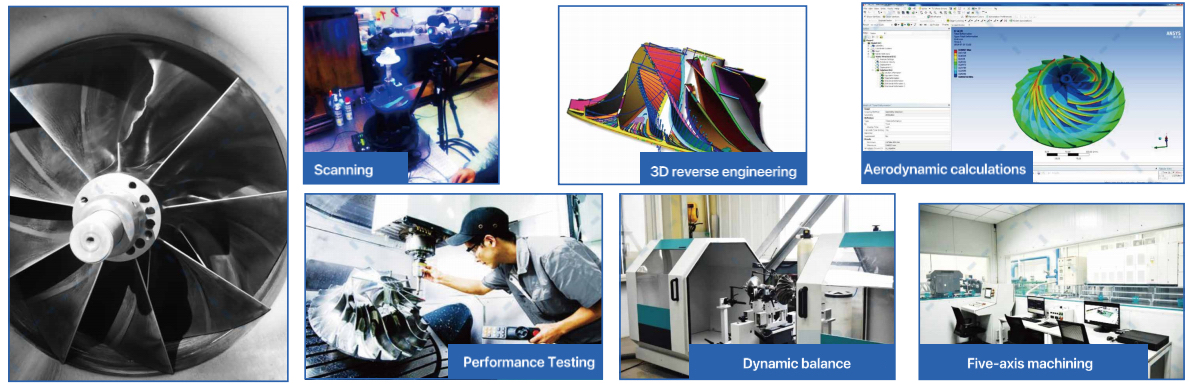 Scanning → 3D anti-guidance → Data analysis and aerodynamic calculations (performance and strength) → 5-axis machining → CMM → Fluorescence testing →Dynamic balancing → Over-spin → CMM → Fluorescence testing → System qualification testing.